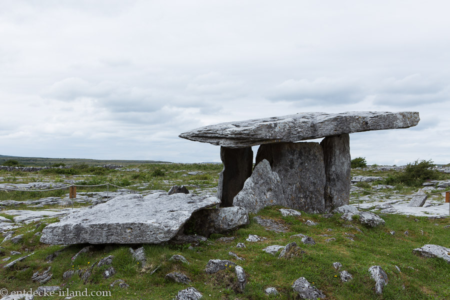 Als wir den Dolmen zwischen Leamanah und Ballyvaughan erreichen, stehen wir stattdessen in einer grauen Landschaft. Der Himmel ist grau, der Dolmen ohnehin und auch in der Umgebung, eine Karstlandschaft, dominieren graue Schattierungen. Unterbrochen wird dieses einzig vom Gras, wo immer es sich auf dem kargen Boden behaupten kann.